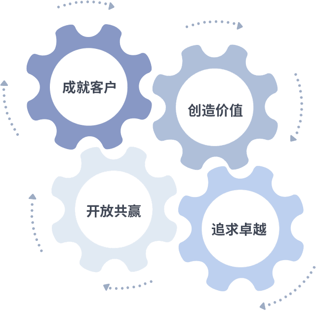 成就客户是一切决策的出发点,,创造价值是衡量所有工作的标准,,,,追求卓越是我们做事做人的态度,,开放共赢是我们的格局也是最终的结果。。。价值观的齿轮环环相扣,,推动着组织里的每个人不断向前。。。。