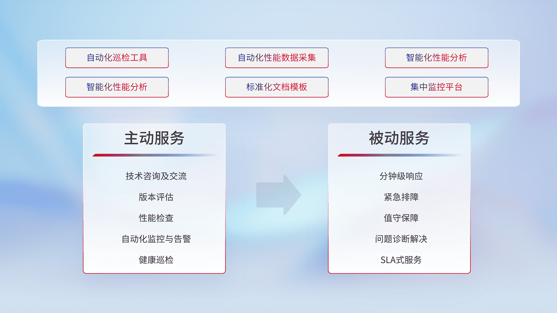 智能化工具和标准化文档,,,,保障服务质量,,提供主动服务(包含技术咨询、、、版本评估、、性能检查、、、、自动化监控与告警、、、健康巡检)和被动服务包含(分钟级响应、、、紧急排障、、值守保障、、、、问题诊断解决、、、SLA服务)。。。。